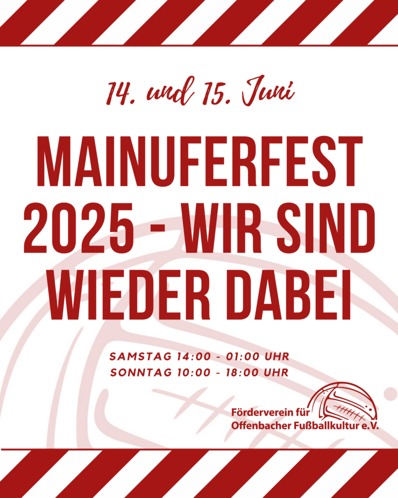 auch in diesem Jahr sind wir wieder mit einem Stand auf dem Mainuferfest vertreten – und wir freuen uns riesig, wenn ihr zahlreich bei uns vorbeischaut! Ihr findet uns wie gewohnt in der Kirchgasse auf Höhe der Hausnummer 30, direkt neben den OFC-Handballer*innen.