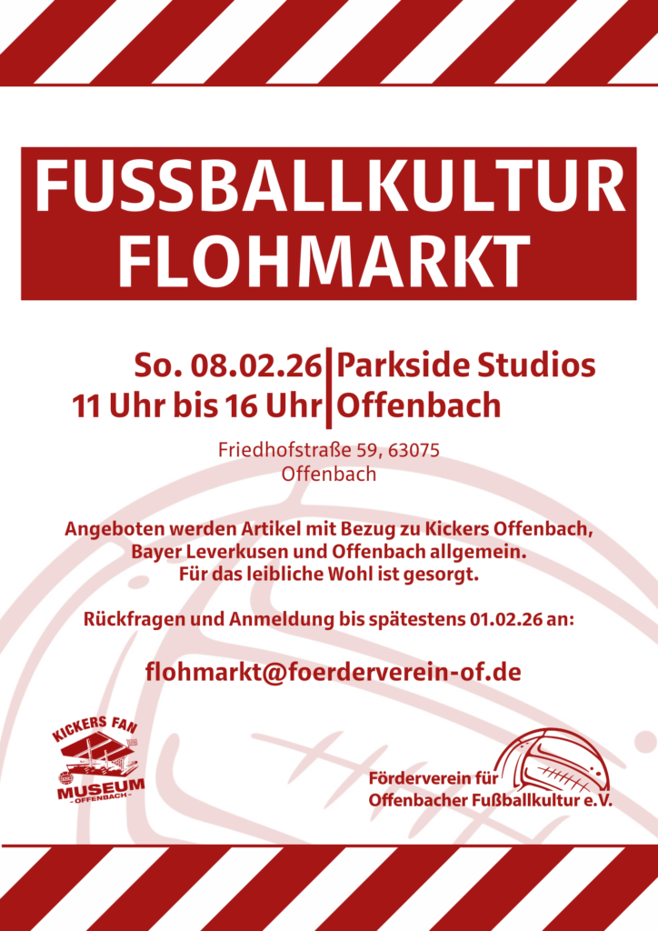 Von 11:00 bis 16:00 Uhr könnt ihr in den Parkside Studios stöbern, feilschen und echte Schätze entdecken. Angeboten wird wieder alles rund um Kickers Offenbach, Bayer Leverkusen und Offenbach im Allgemeinen.